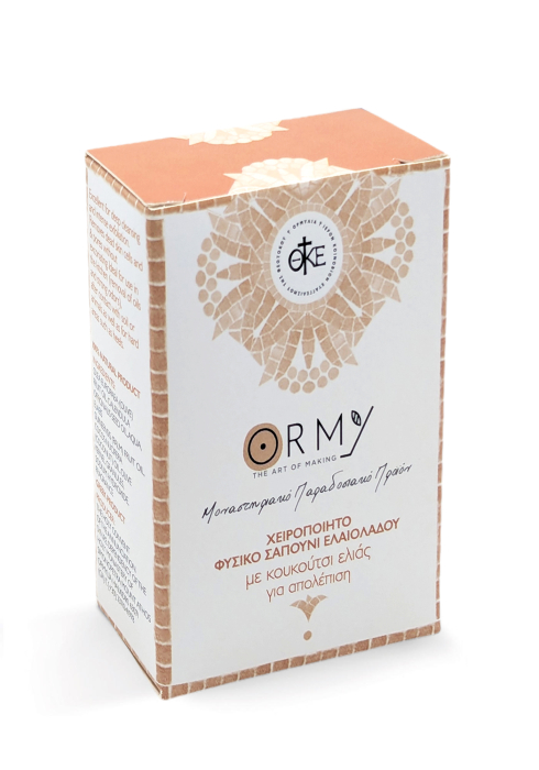 Săpun natural cu ulei de măsline făcut manual cu sâmburi de măsline pentru exfoliere.